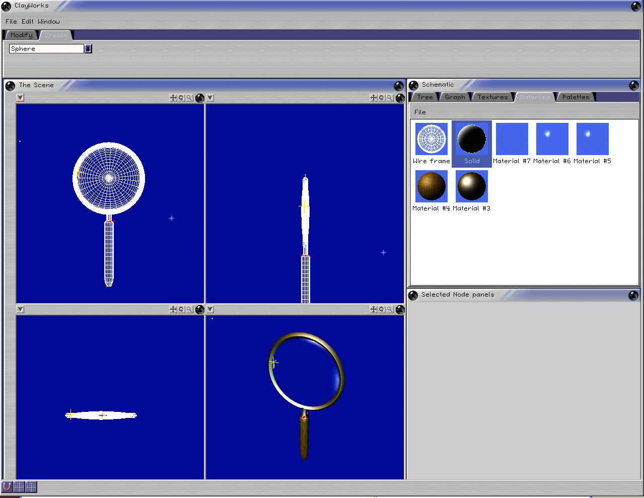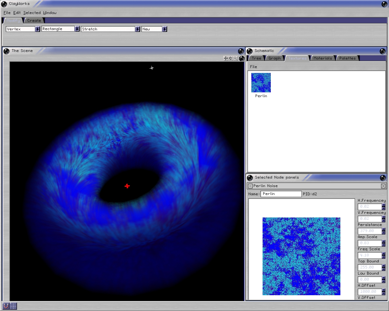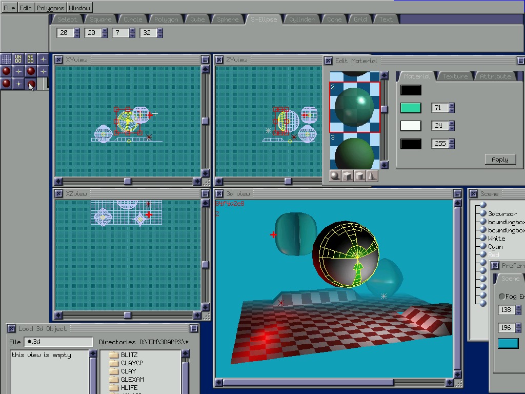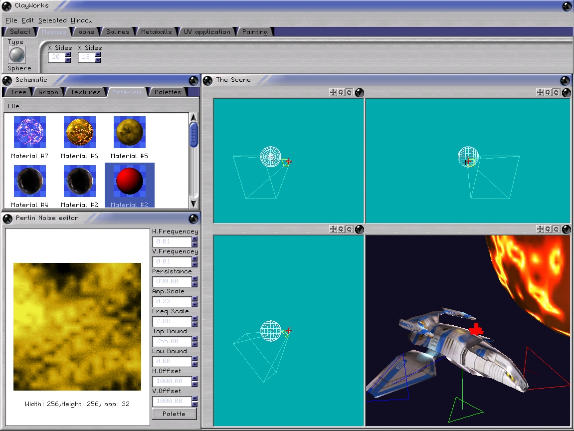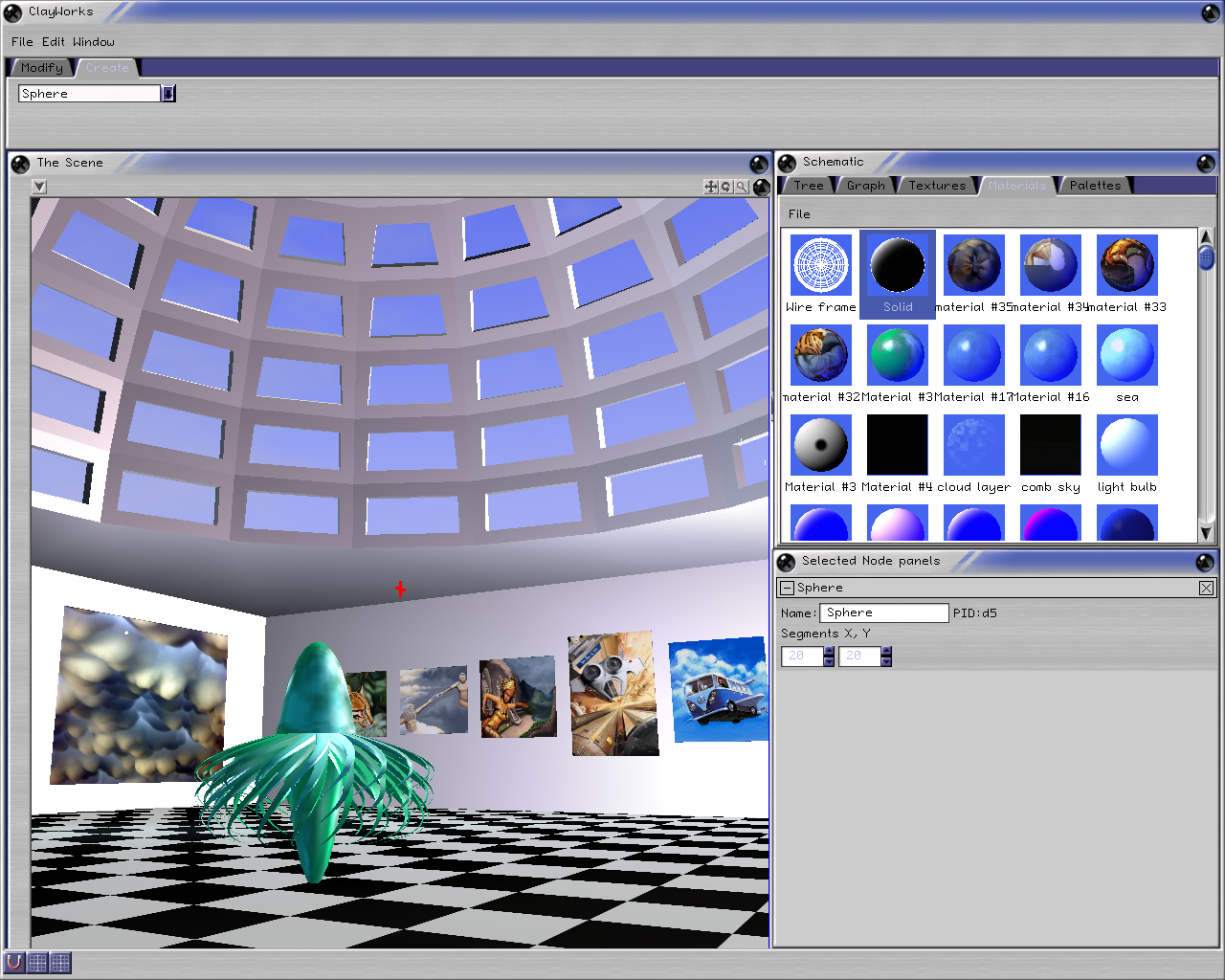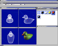 Despite the demands of my day job (12 hours a day doing webpages for a firm in Tokyo), work on the new version of Clayworks is well underway. All of the modeling tools are there, the selection mechanism and interface is 90% complete. The materials editor is also up and running with full realtime object preview as shown here.