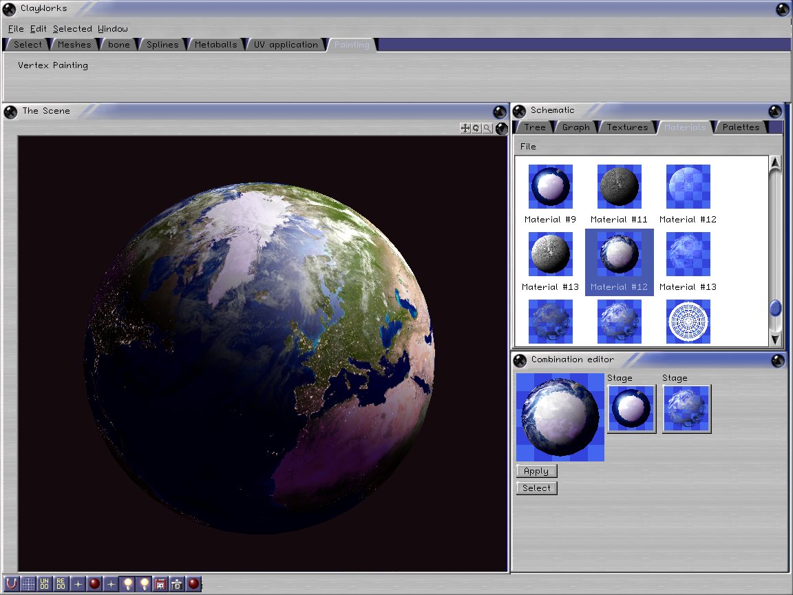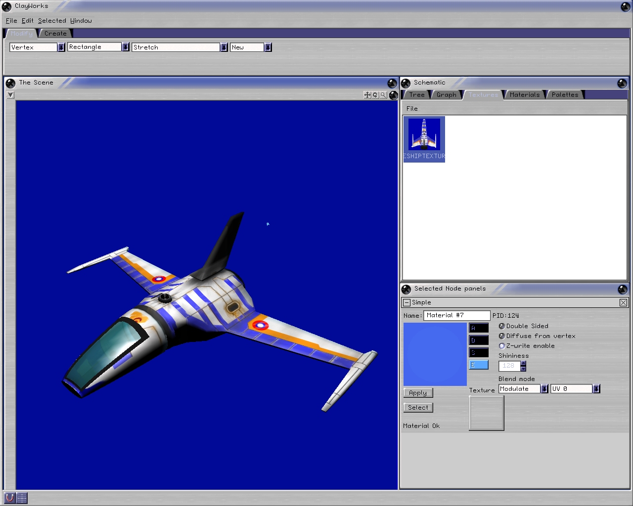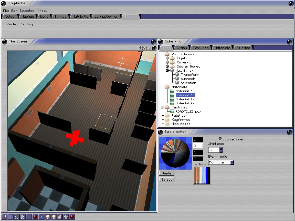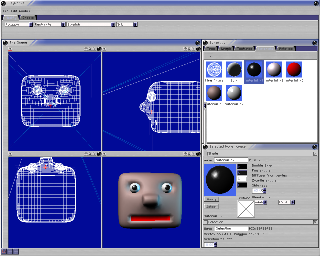 There are many things I plan to add in the comming weeks; The next step is to add code for copying and also extrusion, after that comes the tools to perform texture mapping. Another feature I will add shortly is vertex level material mapping; this will let you apply a different set of material values to a vertex, rather than just a polygon face; applying these is really easy. Just go into the materials dialog, click the material tab and then the 'apply' button will apply the current material to whatever vertices, edges, polygons or objects are selected (exactly which depends on the current selection level, which is clearly marked). I have been careful to retain paradigms across the program, functions that are complex in more convoluted software will be very easy in Clayworks' WYSIWYG enviroment.