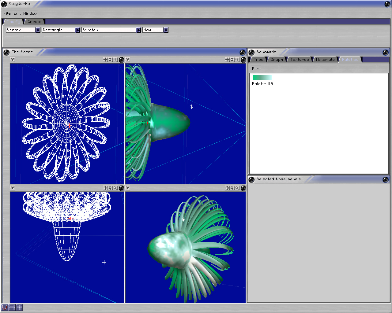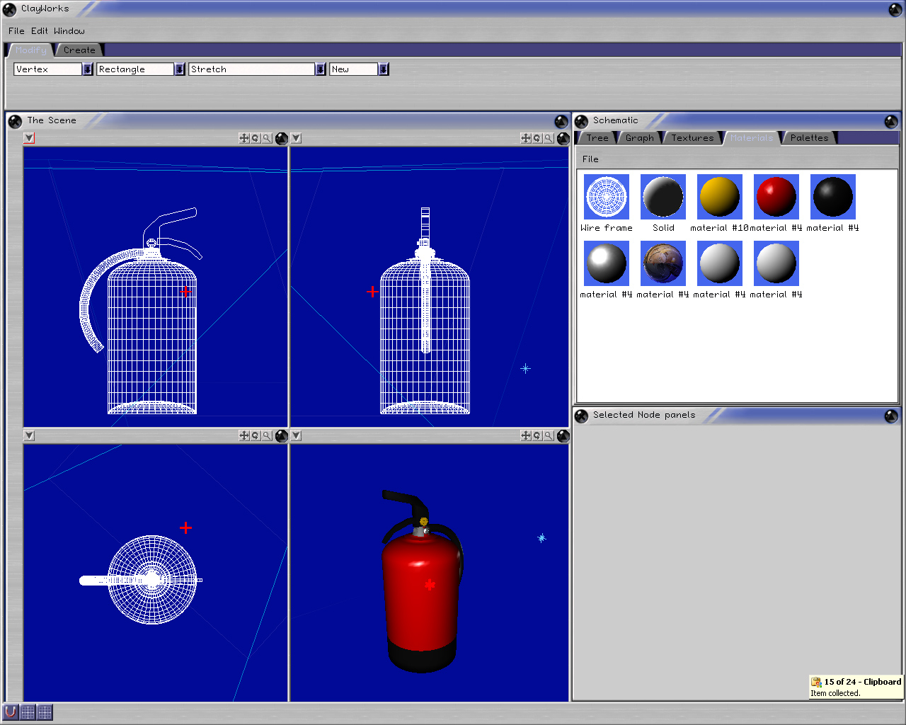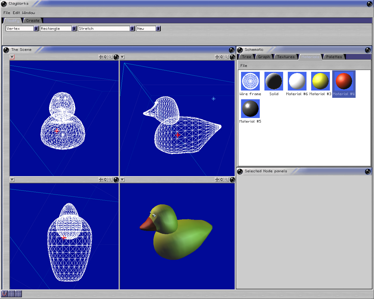 There are many things I plan to add in the comming weeks; The next step is to add code for copying and also extrusion, after that comes the tools to perform texture mapping. Another feature I will add shortly is vertex level material mapping; this will let you apply a different set of material values to a vertex, rather than just a polygon face; applying these is really easy. Just go into the materials dialog, click the material tab and then the 'apply' button will apply the current material to whatever vertices, edges, polygons or objects are selected (exactly which depends on the current selection level, which is clearly marked). I have been careful to retain paradigms across the program, functions that are complex in more convoluted software will be very easy in Clayworks' WYSIWYG enviroment.
