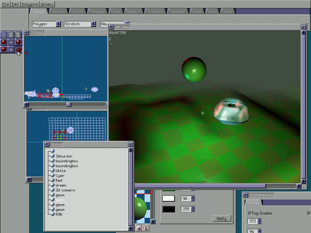 Skins are now supported for the interface but this needs some finalization; As I want it to be as flexible as possible, a scripting language is needed and I want to get this right. At the moment, I'm concentrating on the modeling tools; I shall finish off the skins system soon and I've already designed some rather groovy ones. The scripting language will allow all kinds of placement for window border icons, menu backgrounds and so on. It will allow tiling and streching of window borders for different effects; alpha blending and transparency are also on the cards although I'm uncertain how these will translate to existing windowing systems.